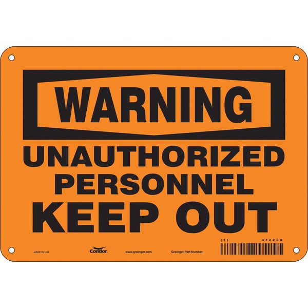 Safety Sign, 7 in Height, 10 in Width, Aluminum, Vertical Rectangle, English, 472Z08SKU G5216239Categories SafetyDescription Safety Sign, Vertical Rectangle, Number of Printed Sides 1, English, Sign Format Traditional OSHA, Sign Legend Unauthorized Personnel Keep Out, Sign Legend Background Color Orange, Sign Legend Style TextgraingerSKU: 472Z08, mscSKU: , zoro_no: G5216239, mongo_id: 65bbe76d3aaddbd5a9093a50