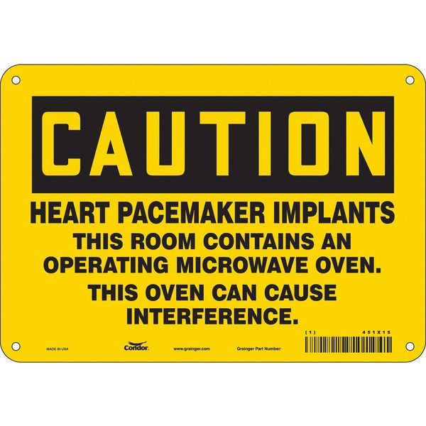 SKU G5292207Categories SafetyDescription Safety Sign Radiofrequency/Microwave, Vertical Rectangle, Number of Printed Sides 1, English, Sign Format Traditional OSHA, Sign Legend Heart Pacemaker Implants This Room Contains An Operating Microwave Oven This Oven Can Cause Interference, Sign Legend Background Color Yellow, Sign Legend Style Text Safety Sign Radiofrequency/Microwave, 7 in H, 10 in W, Aluminum, Vertical Rectangle, 451X15