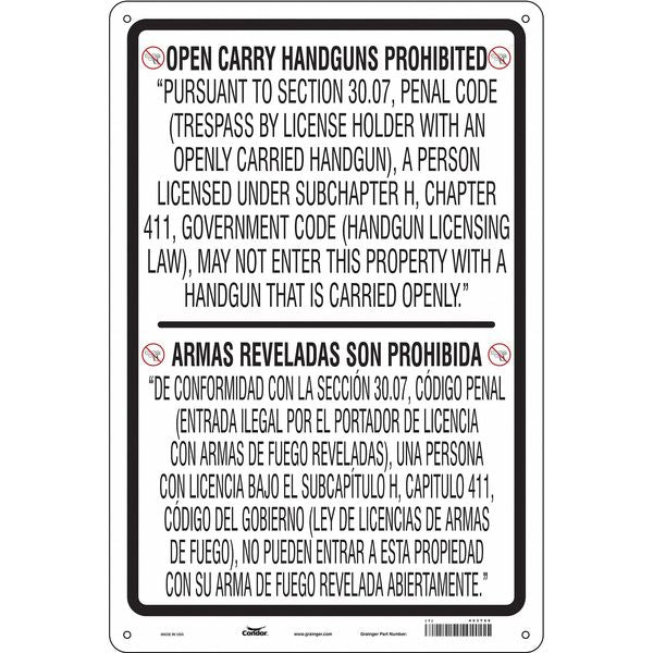 SKU G5780737Categories SafetyDescription No Concealed Weapons Sign, Vertical Rectangle, Number of Printed Sides 1, English, Spanish, Sign Format Other Format, Sign Legend Prohibiting Handguns In A Business Or Other Entity In.Pursuant To Section 30.06, Penal Code (Trespass By License Holder With A Concealed Handgun), A Person Licensed Under Subchapter H, Chapter 411, Government Code (Handgun Licensing Law), May Not Enter This, Sign Legend Background Color White, Sign Legend Style Text No Concealed Weapons Sign, 36 in Height, 24 in Width, Aluminum, Vertical Rectangle