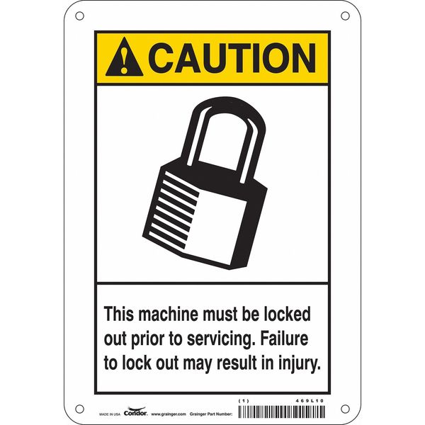 SKU G5642408Categories SafetyDescription Safety Sign, Horizontal Rectangle, Number of Printed Sides 1, English, Sign Format ANSI/OSHA Format, Sign Legend This Machine Must Be Locked Out Prior To Servicing. Failure To Lock Out May Result In Injury., Sign Legend Background Color White, Sign Legend Style Symbol and Text Safety Sign, 10 in Height, 7 in Width, Aluminum, Horizontal Rectangle, English, 469L10