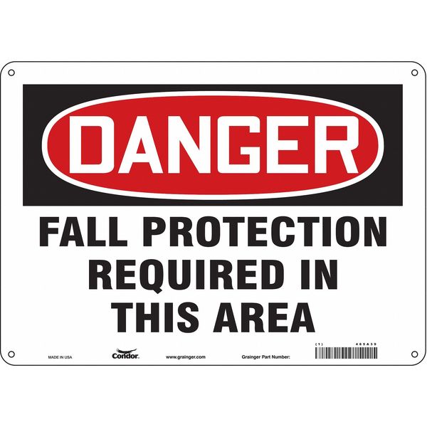 SKU G5077103Categories SafetyDescription Safety Sign, Horizontal Rectangle, Number of Printed Sides 1, English, Sign Format Traditional OSHA, Sign Legend Fall Protection Required In This Area, Sign Legend Background Color White, Sign Legend Style Text Safety Sign, 10 in Height, 14 in Width, Aluminum, Horizontal Rectangle, English, 465A39