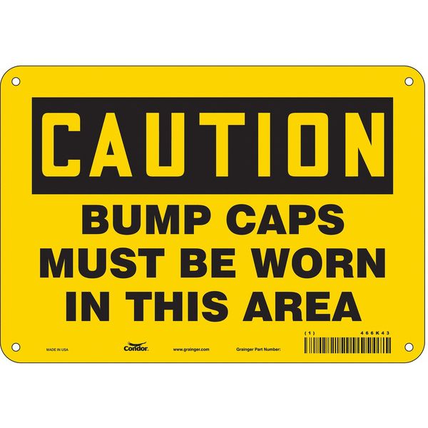 SKU G5825808Categories SafetyDescription Safety Sign, Vertical Rectangle, Number of Printed Sides 1, English, Sign Format Traditional OSHA, Sign Legend Bump Caps Must Be Worn In This Area, Sign Legend Background Color Yellow, Sign Legend Style Text Safety Sign, 7 in Height, 10 in Width, Aluminum, Vertical Rectangle, English, 466K43