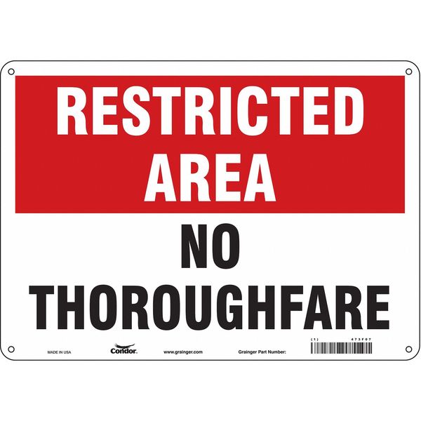 SKU G5633332Categories SafetyDescription Safety Sign, Horizontal Rectangle, Number of Printed Sides 1, English, Sign Format Other Format, Sign Legend No Thoroughfare, Sign Legend Background Color Red, White, Sign Legend Style Text Safety Sign, 10 in Height, 14 in Width, Aluminum, Horizontal Rectangle, English, 473F07