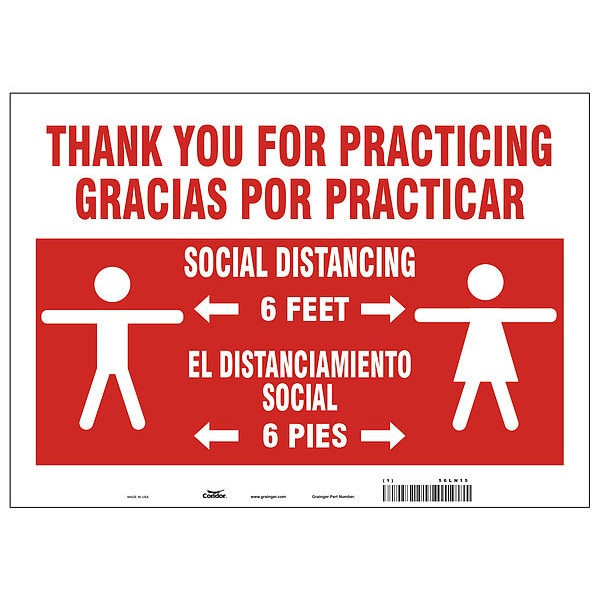 SKU G7654824Categories SafetyDescription Covid 19 Sign 10X14, Eng/Span Practice S, Sign Subject Matter Coronavirus Prevention, Height 10 in, Width 14 in, Sign Material Aluminum, Sign Mounting Style With Mounting Holes, Header Thank You For Practicing/Gracias Por Practicar, Legend Social Distancing 6 Feet/El Distanciamiento Social 6 Pies, Printed Language English, Spanish Sign, Aluminum, , 10" H, , 14" W