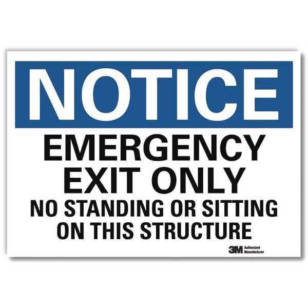 SKU G2763148Categories SafetyDescription Notice Sign, Vertical Rectangle, Number of Printed Sides 1, English, Sign Format Traditional OSHA, Sign Legend Emergency Exit Only No Standing Or Sitting On This Structure, Sign Legend Background Color White, Sign Legend Style Text Notice Sign, 7inx10in, Reflective Sheeting