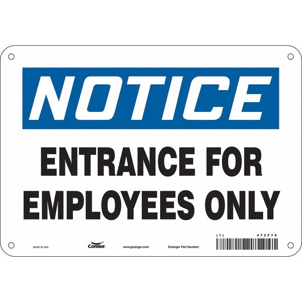 SKU G5881519Categories SafetyDescription Safety Sign, Vertical Rectangle, Number of Printed Sides 1, English, Sign Format Traditional OSHA, Sign Legend Entrance For Employees Only, Sign Legend Background Color White, Sign Legend Style Text Safety Sign, 7 in Height, 10 in Width, Aluminum, Vertical Rectangle, English, 472F78
