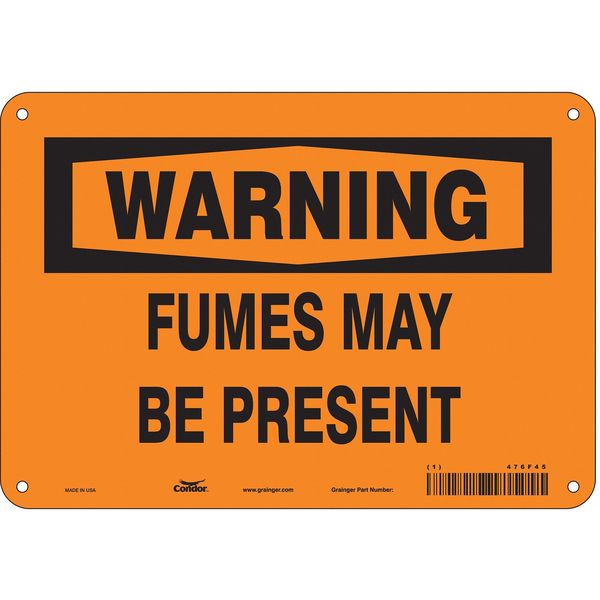 SKU G5788209Categories SafetyDescription Safety Sign, Vertical Rectangle, Number of Printed Sides 1, English, Sign Format Traditional OSHA, Sign Legend Fumes May Be Present, Sign Legend Background Color Orange, Sign Legend Style Text Safety Sign, 7 in Height, 10 in Width, Aluminum, Vertical Rectangle, English, 476F45