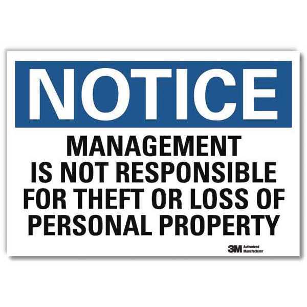 Notice Sign, 5 in H, 7 in W, Reflective Sheeting, Horizontal Rectangle, English, U5-1319-RD_7X5SKU G2760670Categories SafetyDescription Notice Sign, Horizontal Rectangle, Number of Printed Sides 1, English, Sign Legend Management Is Not Responsible For Theft Or Loss Of Personal Property, Sign Legend Background Color White, Sign Legend Style TextgraingerSKU: 34JR22, mscSKU: , zoro_no: G2760670, mongo_id: 65bbe7923aaddbd5a90a1941