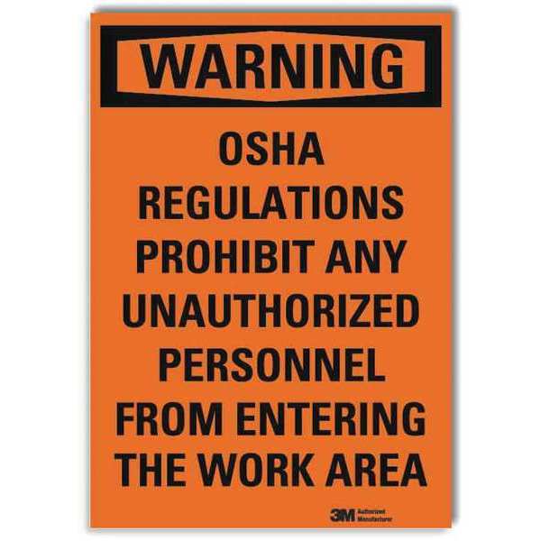 Warning Sign, Black/Orange, Text, 10 in. WSKU G2714750Categories SafetyDescription Security Sign, Vertical Rectangle, Number of Printed Sides 1, English, Sign Format Traditional OSHA, Sign Legend Osha Regulations Prohibit Any Unauthorized Personnel From Entering The Work Area, Sign Legend Background Color Orange, Sign Legend Style TextgraingerSKU: 35KM52, mscSKU: , zoro_no: G2714750, mongo_id: 65bbe7923aaddbd5a90a1a71