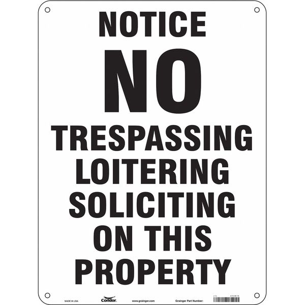 SKU G5531902Categories SafetyDescription Safety Sign, Vertical Rectangle, Number of Printed Sides 1, English, Sign Format Other Format, Sign Legend No Trespassing Loitering Soliciting On This Property, Sign Legend Background Color White, Sign Legend Style Text$52.36 / eachWeb price
