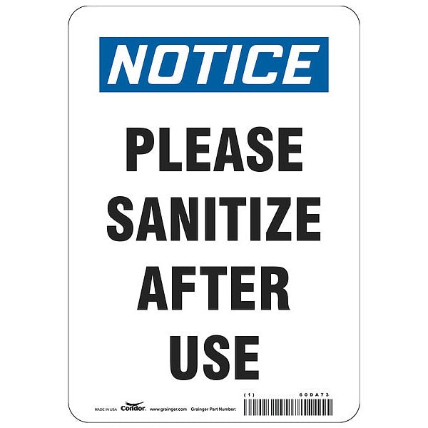 Please Sanitize After Use Sign, 7" W x 10" H, English, PolyesterSKU G8513952Categories SafetyDescription Please Sanitize After Use Sign, Sign Subject Matter Coronavirus Prevention, Height 10 in, Width 7 in, Sign Material Polyester, Sign Mounting Style Adhesive Surface, Header Notice, Legend Please Sanitize After Use, Printed Language English, Sign Shape Rectangle$7.99 / eachWeb price -