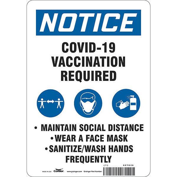 SKU G400460937Categories SafetyDescription Facemask Reminder Safety Sign, Height 10 in, Width 7 in, Sign Material Aluminum, Header Notice, Legend Covid Vaccination Required Maintain Social Distance Wear A Face Mask Sanitize/Wash Hands Frequently, Printed Language English$14.24 / eachWeb price