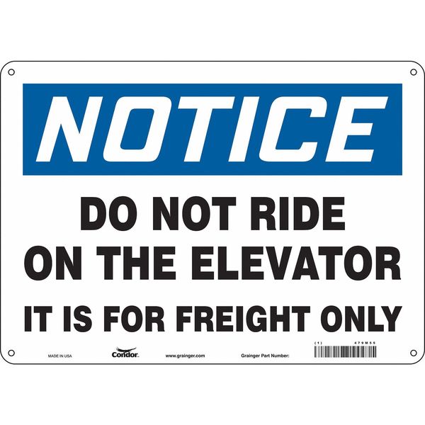 Safety Sign, 10 in Height, 14 in Width, Aluminum, Horizontal Rectangle, English, 479M55SKU G5878868Categories SafetyDescription Safety Sign, Horizontal Rectangle, Number of Printed Sides 1, English, Sign Format Traditional OSHA, Sign Legend Do Not Ride On The Elevator It Is For Freight Only, Sign Legend Background Color White, Sign Legend Style TextgraingerSKU: 479M55, mscSKU: , zoro_no: G5878868, mongo_id: 65bbe7b93aaddbd5a90b054f