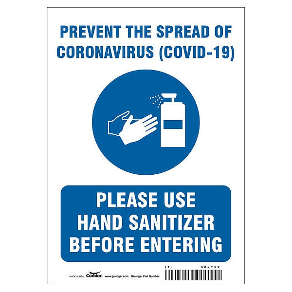 SKU G6617905Categories SafetyDescription Prevent The Spread Of Coronavirus Sign, Sign Subject Matter Coronavirus Prevention, Height 14 in, Width 10 in, Sign Material Polystyrene, Sign Mounting Style With Mounting Holes, Header No Header, Legend Prevent the Spread Of Coronavirus (COVID-19) Please Use Hand Sanitizer Before Entering, Printed Language English, Sign Shape Rectangle$10.61 / eachWeb price