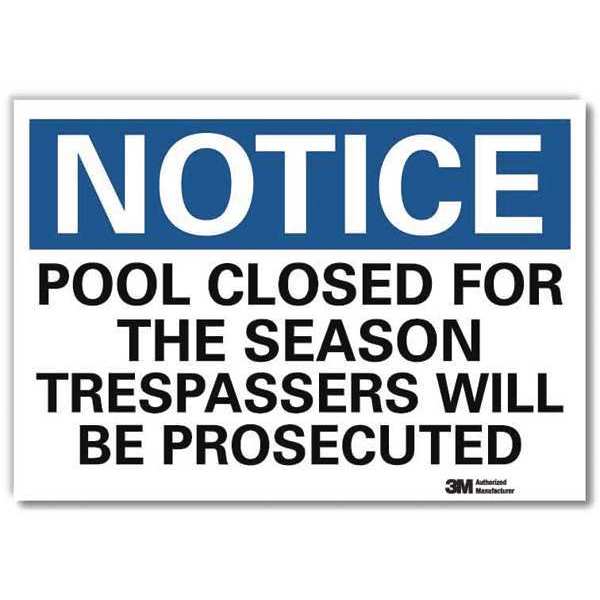 NoticeSign, ReflcSelfAdhVinyl, 14inWx10inH, U5-1459-RD_14X10SKU G2758528Categories SafetyDescription Notice Sign, Horizontal Rectangle, Number of Printed Sides 1, English, Sign Format Traditional OSHA, Sign Legend Pool Closed For The Season Trespassers Will Be Prosecuted, Sign Legend Background Color White, Sign Legend Style Text$6.99 / eachWeb price -