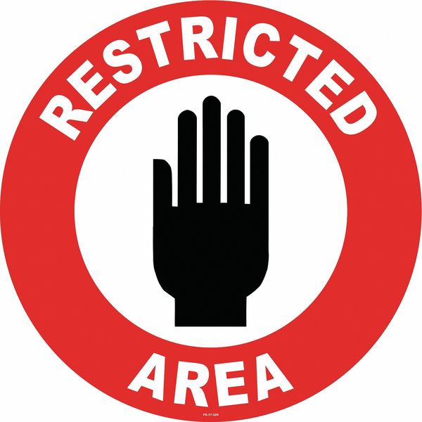 SKU G6258450Categories SafetyDescription Anti-Slip Floor Sign, Circle, Number of Printed Sides 1, English, Sign Format Other Format, Sign Legend Restricted Area, Sign Legend Background Color White, Sign Legend Style Symbol and Text, Sign Legend Character Height 1 5/8 ingraingerSKU: 467F83, mscSKU: , zoro_no: G6258450, mongo_id: 65bbe7649a749db822734343