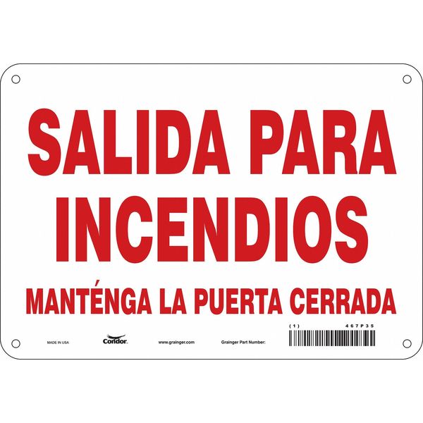Safety Sign Emergency Exit, 7 in Height, 10 in Width, Aluminum, Vertical Rectangle, SpanishSKU G5162171Categories SafetyDescription Safety Sign Emergency Exit, Vertical Rectangle, Number of Printed Sides 1, Spanish, Sign Format Other Format, Sign Legend Salida Para Incendios Mantenga La Puerta Cerrada, Sign Legend Background Color White, Sign Legend Style TextgraingerSKU: 467P35, mscSKU: , zoro_no: G5162171, mongo_id: 65bbe7649a749db82273417b