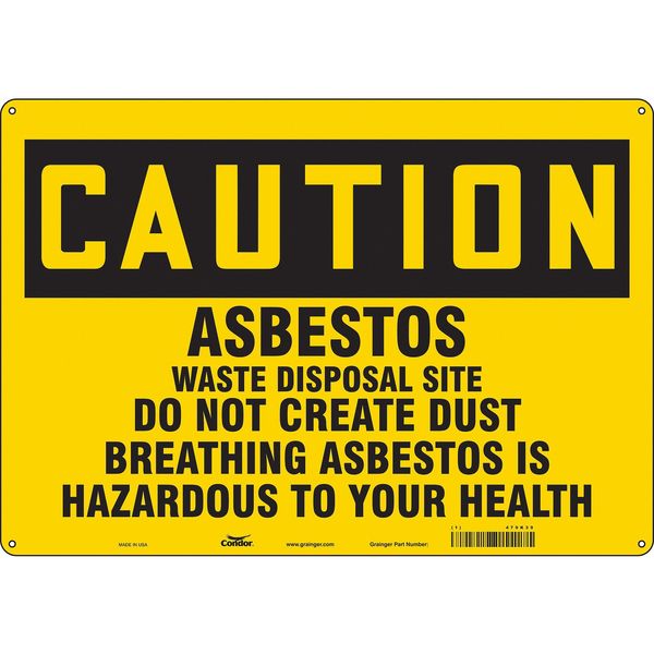 SKU G5800291Categories SafetyDescription Safety Sign, Horizontal Rectangle, Number of Printed Sides 1, English, Sign Format Traditional OSHA, Sign Legend Asbestos Waste Disposal Site Do Not Create Dust Breathing Asbestos Is Hazardous To Your Health, Sign Legend Background Color Yellow, Sign Legend Style TextgraingerSKU: 479K39, mscSKU: , zoro_no: G5800291, mongo_id: 65bbe7649a749db8227341b6