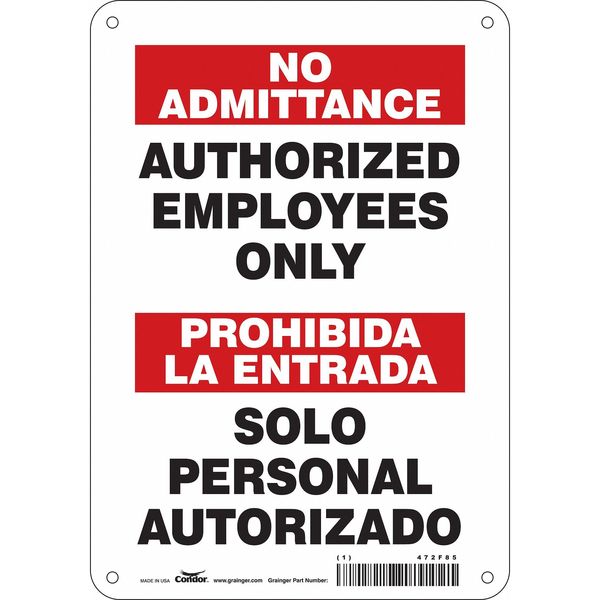Safety Sign, 10 in Height, 7 in Width, Aluminum, Horizontal Rectangle, English, Spanish, 472F85SKU G5059551Categories SafetyDescription Safety Sign, Horizontal Rectangle, Number of Printed Sides 1, English, Spanish, Sign Format Other Format, Sign Legend Authorized Employees Only/Solo Personal Autorizado, Sign Legend Background Color Red, White, Sign Legend Style TextgraingerSKU: 472F85, mscSKU: , zoro_no: G5059551, mongo_id: 65bbe7649a749db8227341b1
