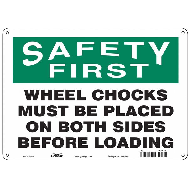 Safety Sign, 10 in Height, 14 in Width, Aluminum, Horizontal Rectangle, English, 477F80SKU G5881333Categories SafetyDescription Safety Sign, Horizontal Rectangle, Number of Printed Sides 1, English, Sign Format Traditional OSHA, Sign Legend Wheels Chocks Must Be Placed On Both Sides Before Loading, Sign Legend Background Color White, Sign Legend Style TextgraingerSKU: 477F80, mscSKU: , zoro_no: G5881333, mongo_id: 65bbe7649a749db822733fcb