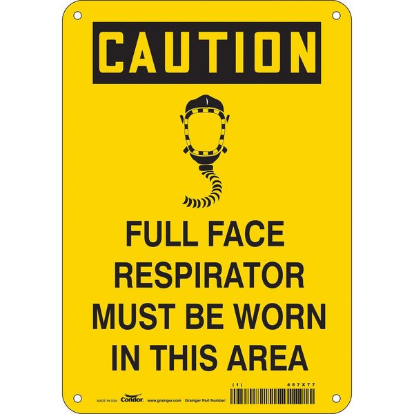 Safety Sign, 10 in Height, 7 in Width, Aluminum, Horizontal Rectangle, English, 467X77SKU G5562109Categories SafetyDescription Safety Sign, Horizontal Rectangle, Number of Printed Sides 1, English, Sign Format Traditional OSHA, Sign Legend Full Face Respirator Must Be Worn In This Area, Sign Legend Background Color Yellow, Sign Legend Style Symbol and TextgraingerSKU: 467X77, mscSKU: , zoro_no: G5562109, mongo_id: 65bbe7463aaddbd5a908532d