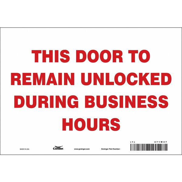 SKU G5536279Categories SafetyDescription Safety Sign, Vertical Rectangle, Number of Printed Sides 1, English, Sign Legend This Door To Remain Unlocked During Business Hours, Sign Legend Background Color White, Sign Legend Style TextgraingerSKU: 471W47, mscSKU: , zoro_no: G5536279, mongo_id: 65bbe7463aaddbd5a90853b0