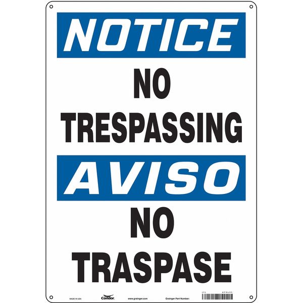 SKU G5591463Categories SafetyDescription Safety Sign, Vertical Rectangle, Number of Printed Sides 1, English, Spanish, Sign Format Traditional OSHA, Sign Legend No Trespassing/No Traspase, Sign Legend Background Color White, Sign Legend Style TextgraingerSKU: 473L31, mscSKU: , zoro_no: G5591463, mongo_id: 65bbe7463aaddbd5a9085483