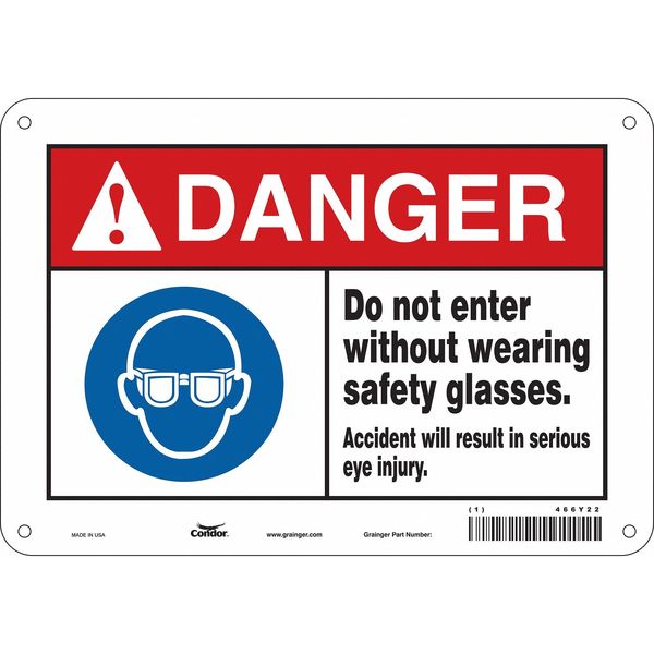 Safety Sign, 7 in Height, 10 in Width, Aluminum, Vertical Rectangle, English, 466Y22SKU G5180931Categories SafetyDescription Safety Sign, Vertical Rectangle, Number of Printed Sides 1, English, Sign Format ANSI/OSHA Format, Sign Legend Do Not Enter Without Wearing Safety Glasses. Accident Will Result In Serious Eye Injury., Sign Legend Background Color White, Sign Legend Style Symbol and TextgraingerSKU: 466Y22, mscSKU: , zoro_no: G5180931, mongo_id: 65bbe7463aaddbd5a9085398