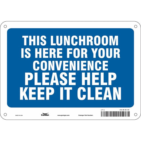 SKU G5243889Categories SafetyDescription Safety Sign, Vertical Rectangle, Number of Printed Sides 1, English, Sign Legend This Lunchroom Is Here For Your Convenience Please Help Keep It Clean, Sign Legend Background Color Blue, White, Sign Legend Style TextgraingerSKU: 468X45, mscSKU: , zoro_no: G5243889, mongo_id: 65bbe7379a749db822725b99