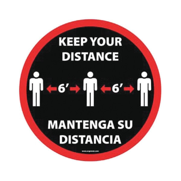 Social Distancing Sign, 12" W x 12" H, English, Spanish, PVC, BlackSKU G3154760Categories SafetyDescription Social Distance Floor Sign, Sign Subject Matter Social Distancing, Height 12 in, Width 12 in, Sign Material PVC, Sign Mounting Style Adhesive Surface, Header No Header, Legend Keep Your Distance Mantenga Su Distancia, Printed Language English, Spanish, Sign Shape Circle$7.36 / eachWeb price