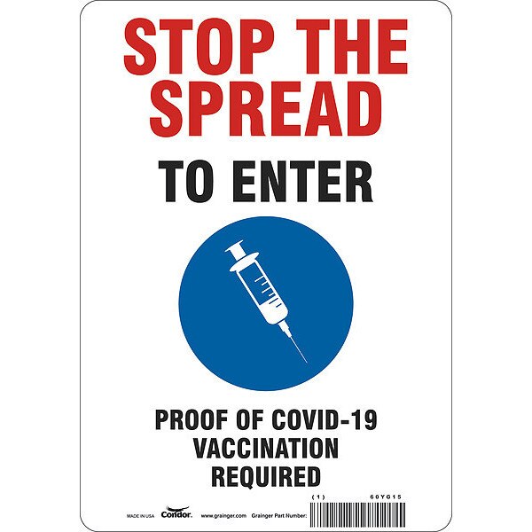 SKU G300460952Categories SafetyDescription Employee/Visitor Vaccine Proof Sign, Height 10 in, Width 7 in, Sign Material Polyethylene, Header Stop The Spread, Legend To Enter Proof Of COVID-19 Vaccination Required, Printed Language English$7.44 / eachWeb price
