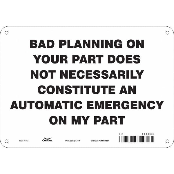 Safety Sign, 7 in Height, 10 in Width, Aluminum, Vertical Rectangle, English, 486N89SKU G6285078Categories SafetyDescription Safety Sign, Vertical Rectangle, Number of Printed Sides 1, English, Sign Legend Bad Planning On Your Part Does Not Necessarily Constitute An Automatic Emergency On My Part, Sign Legend Background Color White, Sign Legend Style TextgraingerSKU: 486N89, mscSKU: , zoro_no: G6285078, mongo_id: 65bbe7379a749db822725a70