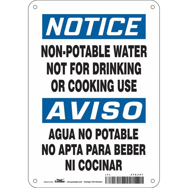 Safety Sign, 10 in Height, 7 in Width, Aluminum, Horizontal Rectangle, English, 470J97SKU G5065720Categories SafetyDescription Safety Sign, Horizontal Rectangle, Number of Printed Sides 1, English, Sign Format Traditional OSHA, Sign Legend Non-Potable Water Not For Drinking Or Cooking Use/Agua No Potable No Apta Para Beber Ni Cocinar, Sign Legend Background Color White, Sign Legend Style TextgraingerSKU: 470J97, mscSKU: , zoro_no: G5065720, mongo_id: 65bbe7379a749db8227259f2