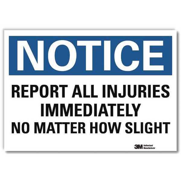 SKU G2758126Categories SafetyDescription Notice Sign, Vertical Rectangle, Number of Printed Sides 1, English, Sign Format Traditional OSHA, Sign Legend Report All Injuries Immediately No Matter How Slight, Sign Legend Background Color White, Sign Legend Style TextgraingerSKU: 34JW04, mscSKU: , zoro_no: G2758126, mongo_id: 65bbe7379a749db82272569b