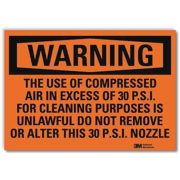 Warning Sign, 7 in H, 10 in W, Vertical Rectangle, English, U6-1232-RD_10X7SKU G2713980Categories SafetyDescription Warning Sign, Vertical Rectangle, Number of Printed Sides 1, English, Sign Format Traditional OSHA, Sign Legend The Use Of Compressed Air In Excess Of 30 P.S.I For Cleaning Purposes Is Unlawful Do Not Remove Or Alter This 30 P.S.I. Nozzle, Sign Legend Background Color Orange, Sign Legend Style TextgraingerSKU: 35KN63, mscSKU: , zoro_no: G2713980, mongo_id: 65bbe7379a749db82272555f