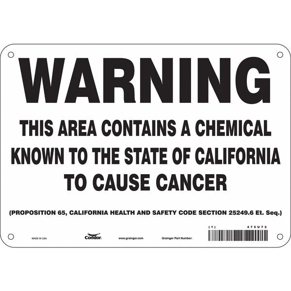 SKU G5894642Categories SafetyDescription Safety Sign, THIS AREA CONTAINS A CHEMICAL KNOWN TO THE STATE OF CALIFORNIA TO CAUSE CANCER (PROPOSITION 65, CALIFORNIA HEALTH AND SAFETY CODE SECTION 25249.6 ET. SEQ.), Aluminum, Height 7 in, Width 10 in, Header No Header, Legend Style Text, Thickness 0.032 in, Sign Shape Rectangle, Operating Temp. Range -40 Degrees to 140 Degrees F, Retroreflective Grade Not RetroreflectivegraingerSKU: 475U72, mscSKU: , zoro_no: G5894642, mongo_id: 65bbe7343aaddbd5a907f941