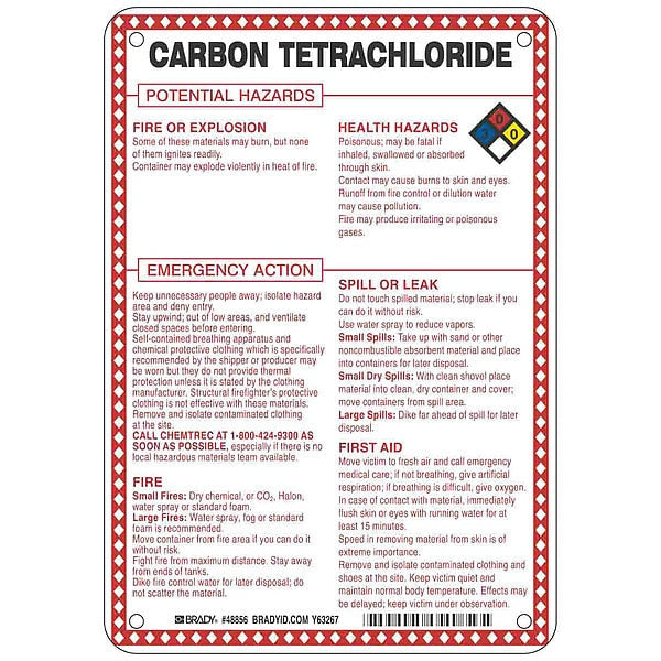 Chemical Sign, 10 in Height, 7 in Width, RectangleSKU G5598826Categories SafetyDescription Chemical Sign, Carbon Tetrachloride Potential Hazards, Fiberglass, Height 10 in, Width 7 in, Header No Header, Legend Style Symbol and Text, Language English, Mounting Style Surface, Thickness 0.1 in, Sign Shape Rectangle, Operating Temp. Range -40 Degrees to 194 Degrees F, Retroreflective Grade Not RetroreflectivegraingerSKU: 41F467, mscSKU: , zoro_no: G5598826, mongo_id: 65bbe74b9a749db82272e35f