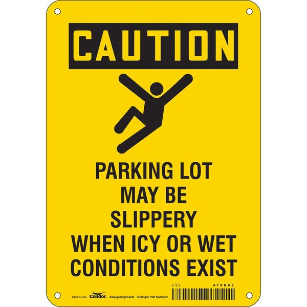 $14.44 / eachWeb priceSafety Sign, 10 in Height, 7 in Width, Aluminum, Horizontal Rectangle, English, 478D63SKU G5851288Categories SafetyDescription Safety Sign, Horizontal Rectangle, Number of Printed Sides 1, English, Sign Format Traditional OSHA, Sign Legend Parking Lot May Be Slippery When Icy Or Wet Conditions Exist, Sign Legend Background Color Yellow, Sign Legend Style Symbol and TextgraingerSKU: 478D63, mscSKU: , zoro_no: G5851288, mongo_id: 65bbe83422d7a989a98dfae0