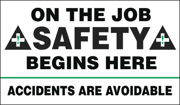 SKU G6122365Categories SafetyDescription Safety Banner, Shape Horizontal Rectangle, Safety Banner Legend On The Job Safety Begins Here Accidents Are Avoidable, Sign Legend Style Symbol and Text, Printed Language English, Background Color White, Number of Printed Sides 1, Width 48 in, Height 28 in, Thickness 0.013 ingraingerSKU: 8PXH3, mscSKU: , zoro_no: G6122365, mongo_id: 65bbea6522d7a989a99b1191