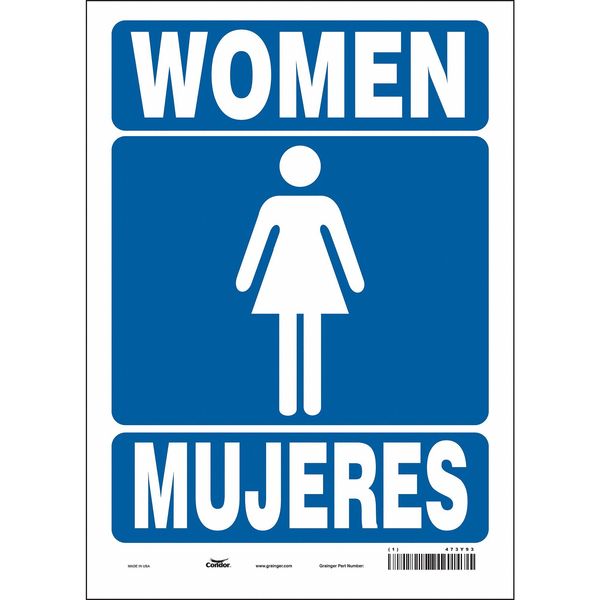 SKU G5644103Categories SafetyDescription Restroom Sign, Vertical Rectangle, Number of Printed Sides 1, English, Spanish, Sign Legend Women/Mujeres, Sign Legend Background Color Blue, Sign Legend Style Symbol and TextgraingerSKU: 473Y93, mscSKU: , zoro_no: G5644103, mongo_id: 65bbee2b526e052139af3098