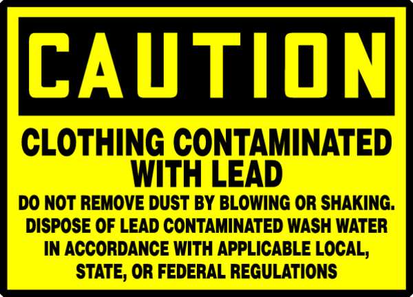 SKU G3982422Categories SafetyDescription Safety Label, Horizontal Rectangle, Number of Printed Sides 1, English, Sign Format Traditional OSHA, Sign Legend Clothing Contaminated with Lead Do Not Remove Dust By Blowing or Shaking Dispose of Lead Contaminated Wash Water In Accordance with Applicable Local, State or Federal Regulations, Sign Legend Background Color White, Sign Legend Style Text, Package Quantity 5graingerSKU: 6CGK3, mscSKU: , zoro_no: G3982422, mongo_id: 65bbee2b526e052139af32d3