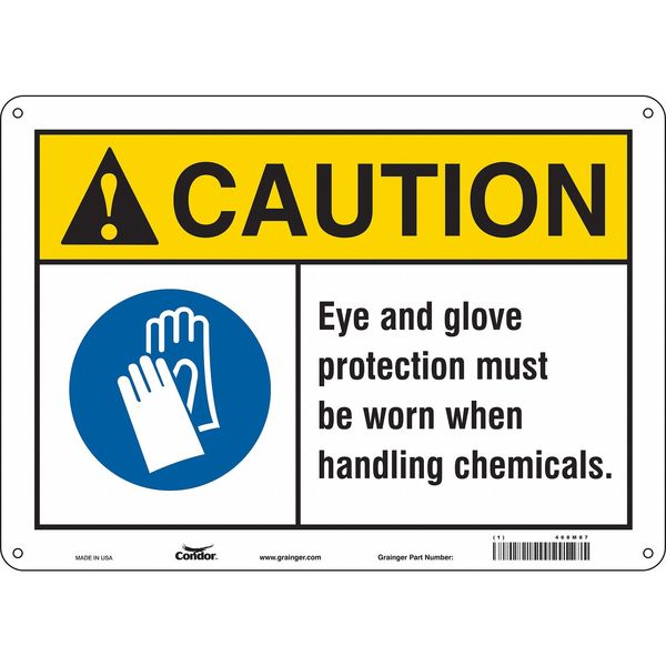 Safety Sign, 10 in Height, 14 in Width, Aluminum, Horizontal Rectangle, English, 468M87SKU G5649207Categories SafetyDescription Safety Sign, Horizontal Rectangle, Number of Printed Sides 1, English, Sign Format ANSI/OSHA Format, Sign Legend Eye And Glove Protection Must Be Worn When Handling Chemicals., Sign Legend Background Color White, Sign Legend Style Symbol and TextgraingerSKU: 468M87, mscSKU: , zoro_no: G5649207, mongo_id: 65bbee2b526e052139af30a7
