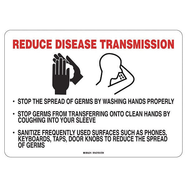 Reduce Disease Transmission Sign, 14" W x 10" H, English, AluminumSKU G7660774Categories SafetyDescription Covid 19 Sign 10X14 Reduce Disease, Alum, Sign Subject Matter Coronavirus Prevention, Height 10 in, Width 14 in, Sign Material Aluminum, Header No Header, Legend Reduce Disease Transmission Keep The Spread Of Germs By Washing Hands Properly Stop Germs From Transferring Onto Clean Hands By Coughing Into Your Sleeve Sanitize Frequently Used Surfaces Such As Phones, Keyboards, Taps, Door Knobs To Reduce The Spread Of Germs, Printed Language English$26.99 / eachWeb price