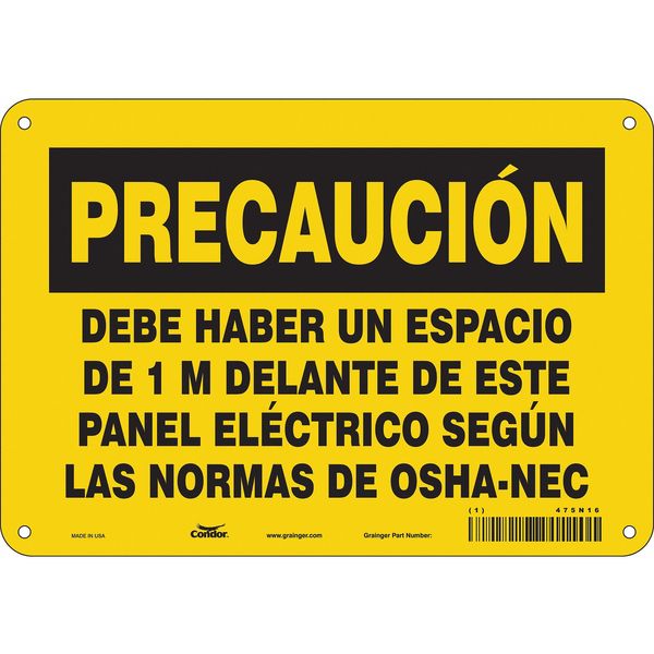 Safety Sign, 10" W, 7" H, 0.032" ThicknessSKU G5578321Categories SafetyDescription Safety Sign, Vertical Rectangle, Number of Printed Sides 1, Spanish, Sign Legend Debe Haber Un Espacio De 1 M Delante De Este Panel Electrico Seguin Las Normas De Osha-Nec, Sign Legend Background Color Yellow, Sign Legend Style TextgraingerSKU: 475N16, mscSKU: , zoro_no: G5578321, mongo_id: 65bbee2b526e052139af2f45