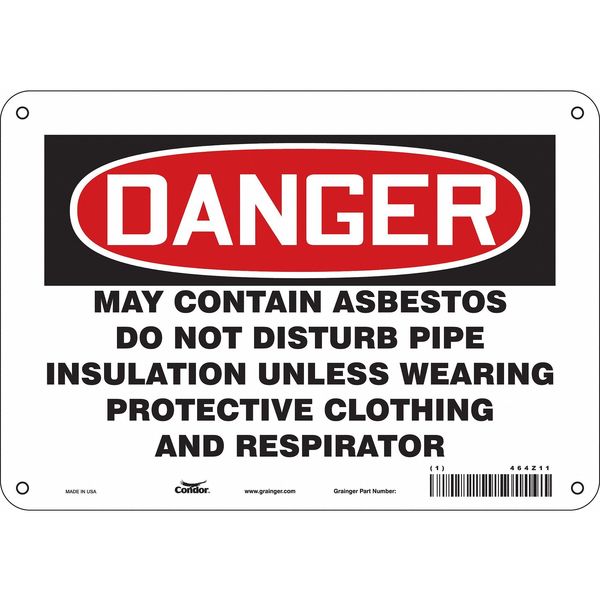 Safety Sign, 7 in Height, 10 in Width, Aluminum, Vertical Rectangle, English, 464Z11SKU G5084340Categories SafetyDescription Safety Sign, Vertical Rectangle, Number of Printed Sides 1, English, Sign Format Traditional OSHA, Sign Legend May Contain Asbestos Do Not Disturb Pipe Insulation Unless Wearing Protective Clothing And Respirator, Sign Legend Background Color White, Sign Legend Style TextgraingerSKU: 464Z11, mscSKU: , zoro_no: G5084340, mongo_id: 65bbee06526e052139ae4b26