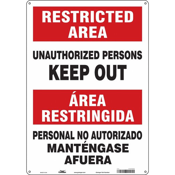 SKU G5833523Categories SafetyDescription Safety Sign, Vertical Rectangle, Number of Printed Sides 1, English, Spanish, Sign Format Other Format, Sign Legend Unauthorized Persons Keep Out/Personal No Autorizado Mantengase Afuera, Sign Legend Background Color Red, White, Sign Legend Style TextgraingerSKU: 472Y02, mscSKU: , zoro_no: G5833523, mongo_id: 65bbee06526e052139ae4ab7