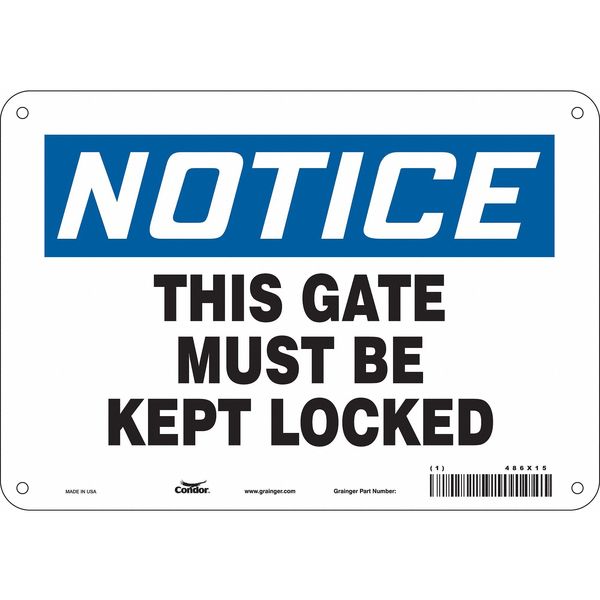 Safety Sign, 7 in Height, 10 in Width, Aluminum, Vertical Rectangle, English, 486X15SKU G6256098Categories SafetyDescription Safety Sign, Vertical Rectangle, Number of Printed Sides 1, English, Sign Legend This Gate Must Be Kept Locked, Sign Legend Background Color White, Sign Legend Style TextgraingerSKU: 486X15, mscSKU: , zoro_no: G6256098, mongo_id: 65bbee06526e052139ae4a98