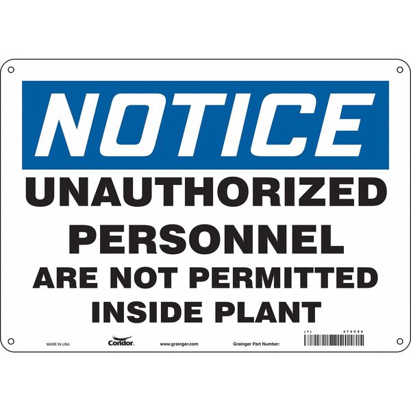 Safety Sign, 10 in Height, 14 in Width, Aluminum, Horizontal Rectangle, English, 472V92SKU G5626673Categories SafetyDescription Safety Sign, Horizontal Rectangle, Number of Printed Sides 1, English, Sign Format Traditional OSHA, Sign Legend Unauthorized Personnel Are Not Permitted Inside Plant, Sign Legend Background Color White, Sign Legend Style TextgraingerSKU: 472V92, mscSKU: , zoro_no: G5626673, mongo_id: 65bbee06526e052139ae4a42