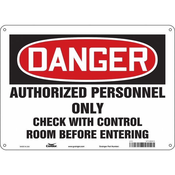 Safety Sign, 10 in Height, 14 in Width, Aluminum, Horizontal Rectangle, English, 472M03SKU G5094518Categories SafetyDescription Safety Sign, Horizontal Rectangle, Number of Printed Sides 1, English, Sign Format Traditional OSHA, Sign Legend Authorized Personnel Only Check With Control Room Before Entering, Sign Legend Background Color White, Sign Legend Style TextgraingerSKU: 472M03, mscSKU: , zoro_no: G5094518, mongo_id: 65bbee06526e052139ae4afa