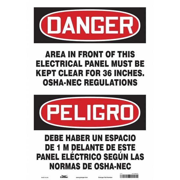 SKU G5786632Categories SafetyDescription Safety Sign, Vertical Rectangle, Number of Printed Sides 1, English, Spanish, Sign Format Traditional OSHA, Sign Legend Area In Front Of This Electrical Panel Must Be Kept Clear For 36 Inches. OSHA-NEC Regulations/Debe Haber Un Espacio De 1M Delante De Este Panel Electrico De Acuerdo Las Normas De OSHA-NEC, Sign Legend Background Color White, Sign Legend Style TextgraingerSKU: 475N60, mscSKU: , zoro_no: G5786632, mongo_id: 65bbee06526e052139ae49b2